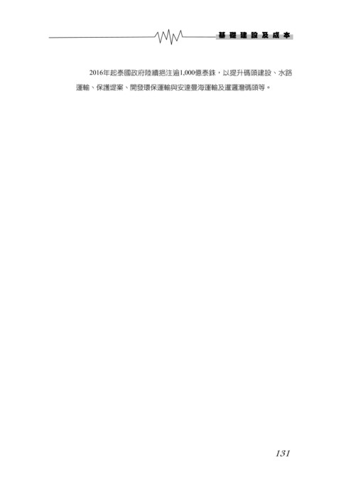 基礎建設及成本 2016年起泰國政府陸續挹注逾1,000億泰銖,以提升碼頭建設、水路 運輸、保護堤案、開發環保運輸與安達曼海運輸及暹邏灣碼頭等。 131