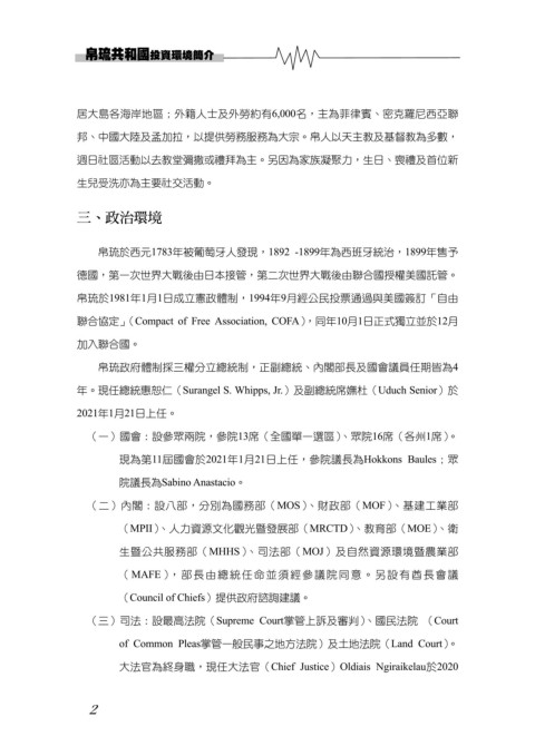 年。現任總統惠恕仁(Surangel S. Whipps, Jr.)及副總統席嫵杜(Uduch Senior)於