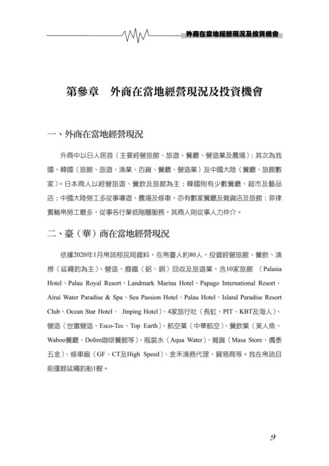 五金)、修車廠(GF、CT及High Speed)、金禾漁務代理、貿易商等。我在帛琉目