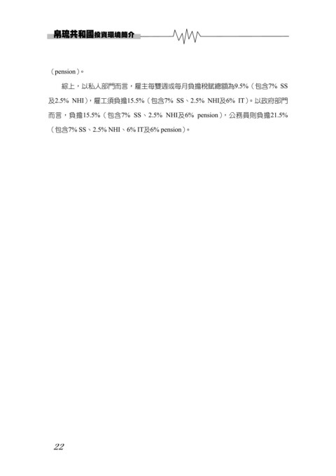 投資環境簡介 (pension)。 綜上,以私人部門而言,雇主每雙週或每月負擔稅賦總額為9.5%(包含7% SS 及2.5% NHI),雇工須負擔15.5%(包含7% SS、2.5% NHI及6% IT)。以政府部門 而言,負擔15.5%(包含7% SS、2.5% NHI及6% pension),公務員則負擔21.5% (包含7% SS、2.5% NHI、6% IT及6% pension)。 22