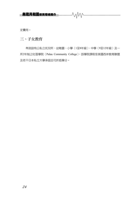 投資環境簡介 定費用。 三、子女教育 帛琉設有公私立托兒所、幼稚園、小學(1至8年級)、中學(9至12年級)及一 所2年制之社區學院(Palau Community College),該學院課程受美國西岸教育聯盟 及若干日本私立大學承認且可折抵學分。 24