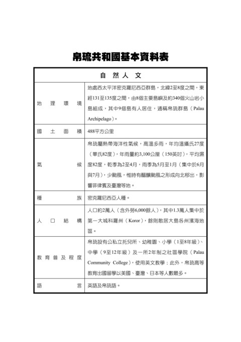 島組成,其中9個島有人居住,通稱帛琉群島(Palau