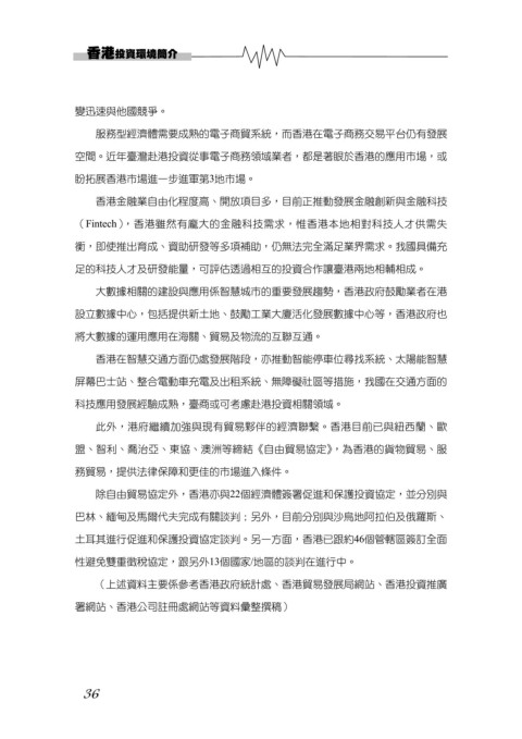 科技應用發展經驗成熟,臺商或可考慮赴港投資相關領域。
