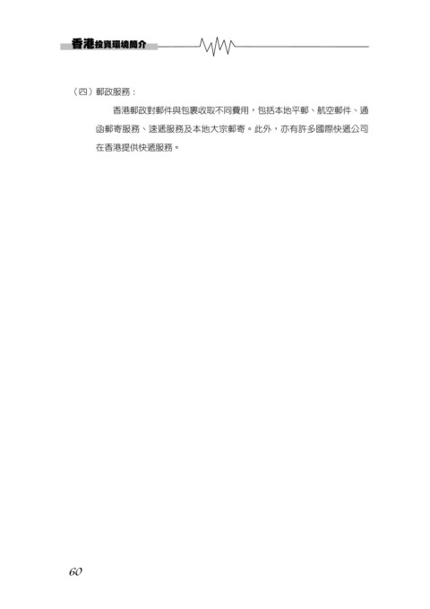 香港投資環境簡介 (四)郵政服務: 香港郵政對郵件與包裹收取不同費用,包括本地平郵、航空郵件、通 函郵寄服務、速遞服務及本地大宗郵寄。此外,亦有許多國際快遞公司 在香港提供快遞服務。 60