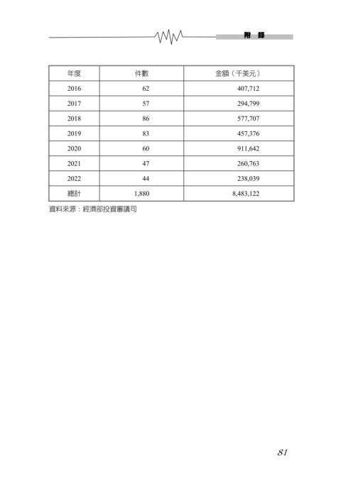 附 錄 年度 件數 金額(千美元) 2016 62 407,712 2017 57 294,799 2018 86 577,707 2019 83 457,376 2020 60 911,642 2021 47 260,763 2022 44 238,039 總計 1,880 8,483,122 資料來源:經濟部投資審議司 81