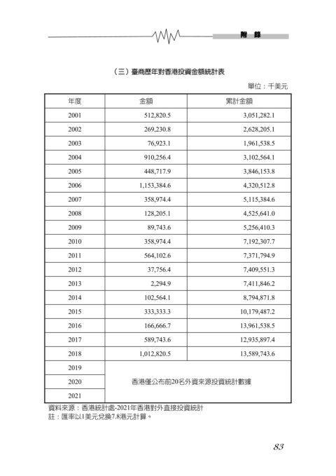 (三)臺商歷年對香港投資金額統計表