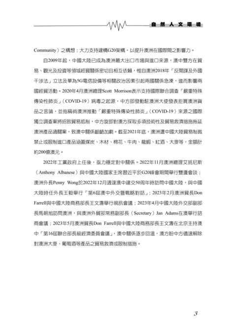 易、觀光及投資等領域經貿關係密切且相互依賴,惟自澳洲2018年「反間諜及外國