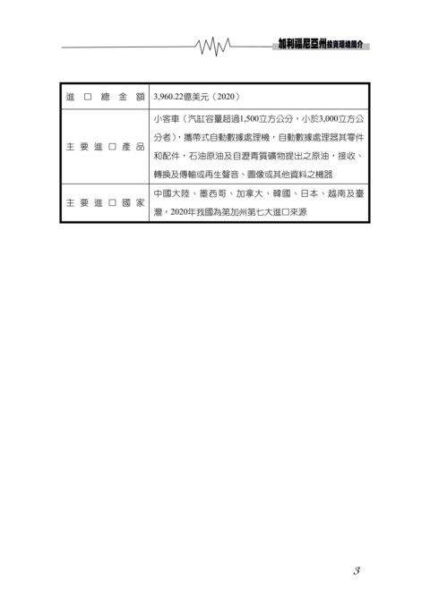 進 口 總 金 額 3,960.22億美元(2020) 小客車(汽缸容量超過1,500立方公分,小於3,000立方公 分者),攜帶式自動數據處理機,自動數據處理器其零件 主要進口產品 和配件,石油原油及自瀝青質礦物提出之原油,接收、 轉換及傳輸或再生聲音、圖像或其他資料之機器 中國大陸、墨西哥、加拿大、韓國、日本、越南及臺 主要進口國家 灣,2020年我國為第加州第七大進口來源 3