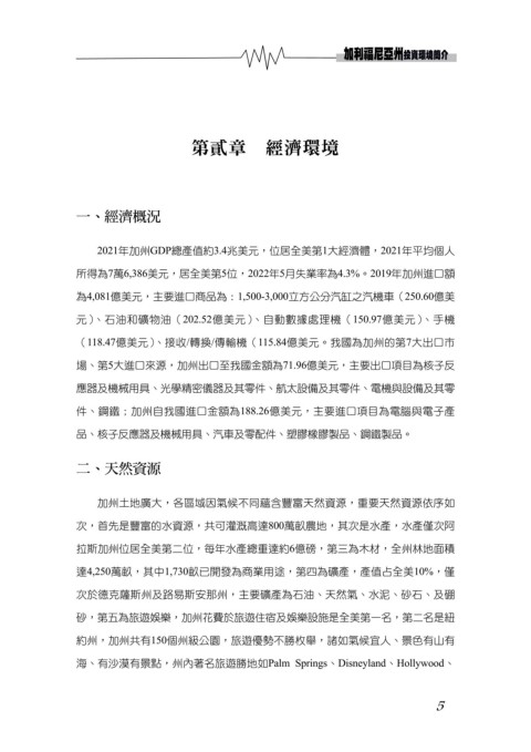 件、鋼鐵;加州自我國進口金額為188.26億美元,主要進口項目為電腦與電子產