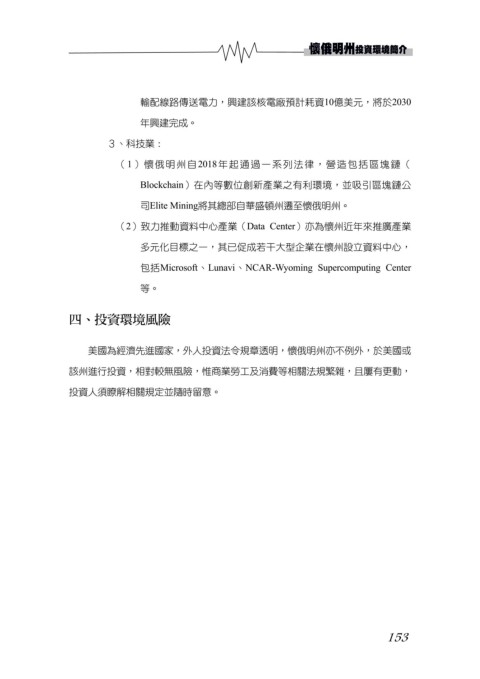 美國為經濟先進國家,外人投資法令規章透明,懷俄明州亦不例外,於美國或