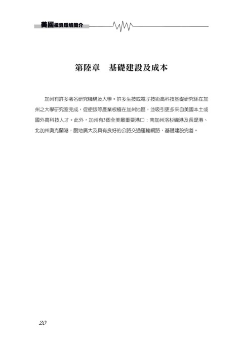美國投資環境簡介 第陸章 基礎建設及成本 加州有許多著名研究機構及大學。許多生技或電子技術高科技基礎研究係在加 州之大學研究室完成,促使該等產業根植在加州地區,並吸引更多來自美國本土或 國外高科技人才。此外,加州有3個全美最重要港口:南加州洛杉磯港及長堤港、 北加州奧克蘭港,腹地廣大及具有良好的公路交通運輸網路,基礎建設完善。 20