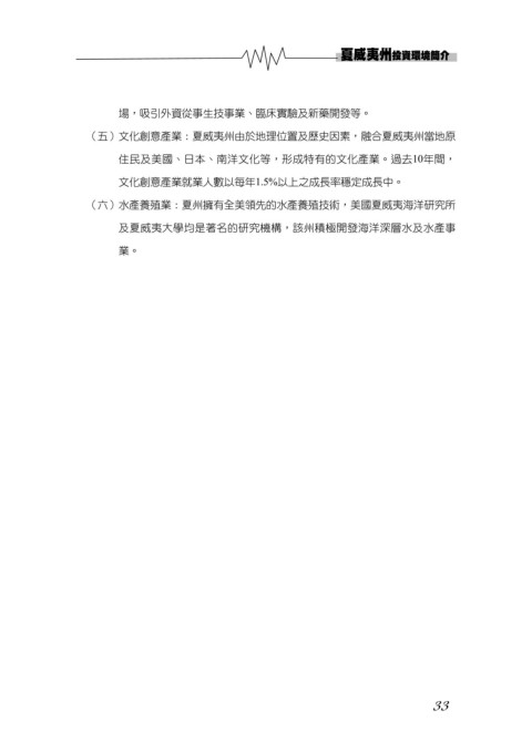 場,吸引外資從事生技事業、臨床實驗及新藥開發等。 (五)文化創意產業:夏威夷州由於地理位置及歷史因素,融合夏威夷州當地原 住民及美國、日本、南洋文化等,形成特有的文化產業。過去10年間, 文化創意產業就業人數以每年1.5%以上之成長率穩定成長中。 (六)水產養殖業:夏州擁有全美領先的水產養殖技術,美國夏威夷海洋研究所 及夏威夷大學均是著名的研究機構,該州積極開發海洋深層水及水產事 業。 33
