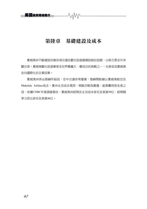 美國投資環境簡介 第陸章 基礎建設及成本 夏威夷州不斷建設改善各項交通及觀光旅遊基礎設施如旅館,以吸引更多外來 觀光客。夏威夷觀光旅遊業是全世界最龐大、最成功的典範之一,也是促成夏威夷 走向國際化的主要因素。 夏威夷州係由島嶼所組成,空中交通非常重要,島嶼間航線以夏威夷航空及 Mukelele Airlines為主。夏州生活成本高昂,稅賦亦較為繁重,能源費用居全美之 冠,依據CNBC年度調查報告,夏威夷州經商及生活成本排名全美第50位,經商競 爭力評比排名全美第46位。 40