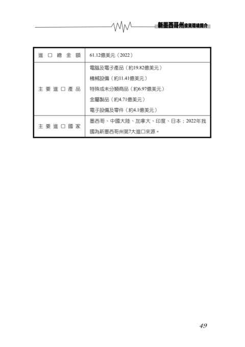 進口總金額 61.12億美元(2022) 電腦及電子產品(約19.82億美元) 機械設備(約11.41億美元) 主要進口產品 特殊或未分類商品(約6.97億美元) 金屬製品(約4.71億美元) 電子設備及零件(約4.1億美元) 墨西哥、中國大陸、加拿大、印度、日本;2022年我 主要進口國家 國為新墨西哥州第7大進口來源。 49