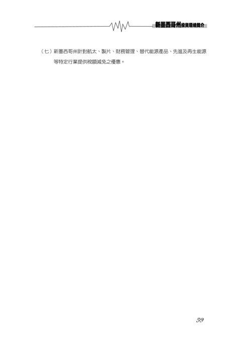(七)新墨西哥州針對航太、製片、財務管理、替代能源產品、先進及再生能源 等特定行業提供稅額減免之優惠。 59
