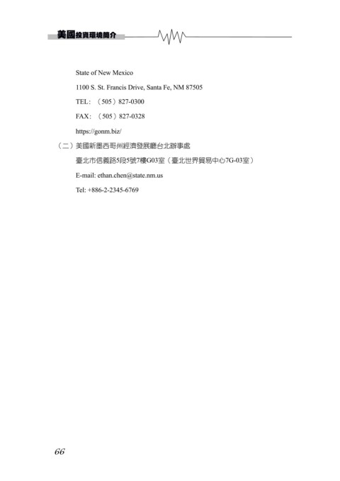 美國投資環境簡介 State of New Mexico 1100 S. St. Francis Drive, Santa Fe, NM 87505 TEL﹕(505)827-0300 FAX﹕(505)827-0328 https://gonm.biz/ (二)美國新墨西哥州經濟發展廳台北辦事處 臺北市信義路5段5號7樓G03室(臺北世界貿易中心7G-03室) E-mail: ethan.chen@state.nm.us Tel: +886-2-2345-6769 66