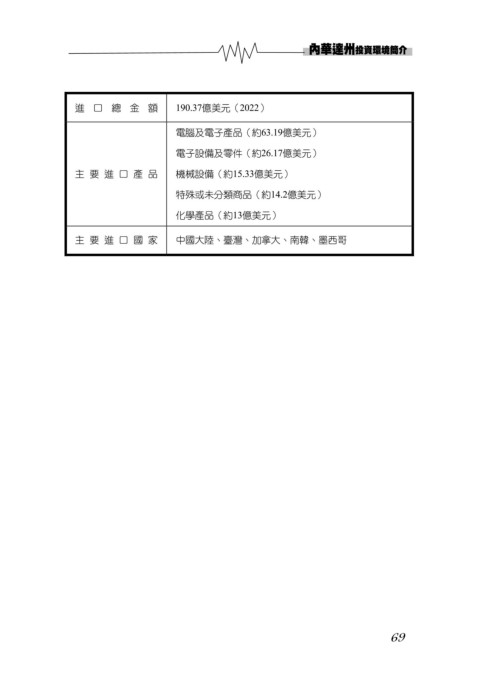 進口總金額 190.37億美元(2022) 電腦及電子產品(約63.19億美元) 電子設備及零件(約26.17億美元) 主要進口產品 機械設備(約15.33億美元) 特殊或未分類商品(約14.2億美元) 化學產品(約13億美元) 主要進口國家 中國大陸、臺灣、加拿大、南韓、墨西哥 69