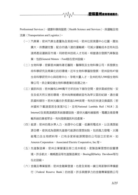 (六)金融及專業服務:密州金融業發達,也是全美唯一擁立兩家聯邦準備銀