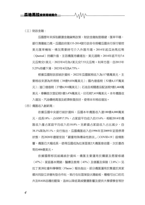 瓜國歷年來採取嚴謹金融貨幣政策,財政金融制度穩健,匯率平穩,