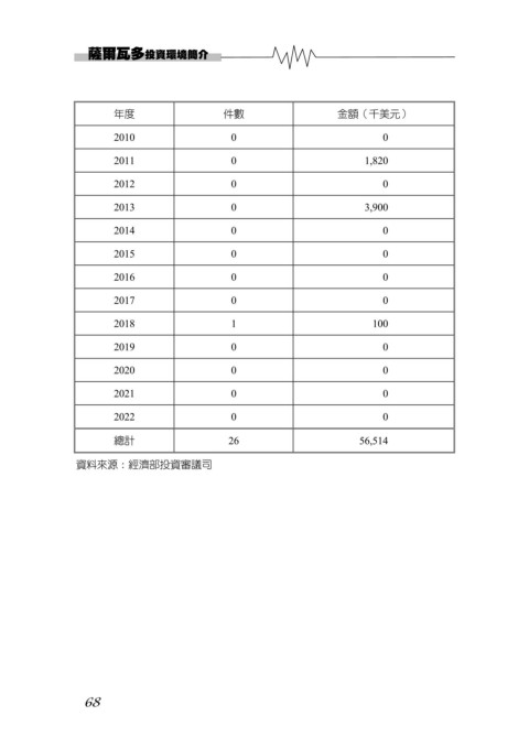 薩爾瓦多投資環境簡介 年度 件數 金額(千美元) 2010 0 0 2011 0 1,820 2012 0 0 2013 0 3,900 2014 0 0 2015 0 0 2016 0 0 2017 0 0 2018 1 100 2019 0 0 2020 0 0 2021 0 0 2022 0 0 總計 26 56,514 資料來源:經濟部投資審議司 68