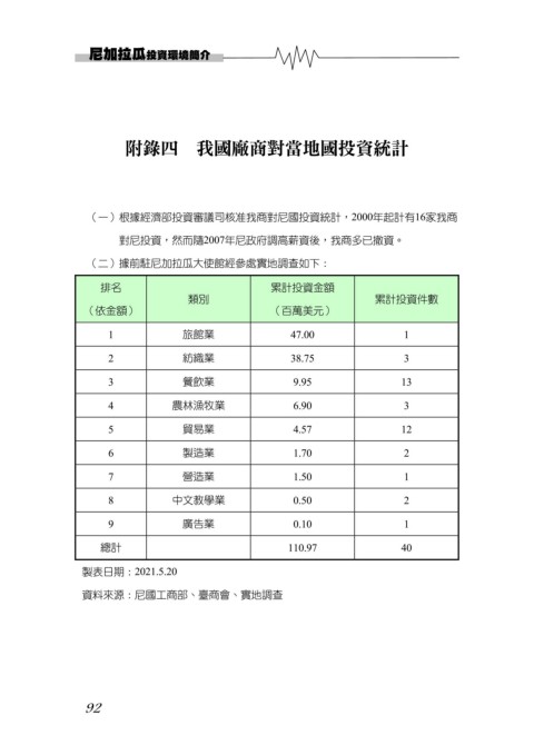 (一)根據經濟部投資審議司核准我商對尼國投資統計,2000年起計有16家我商