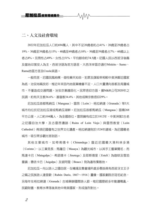 2022年尼加拉瓜人口約694萬人,其中不足20歲者約占41%,20歲至29歲者占