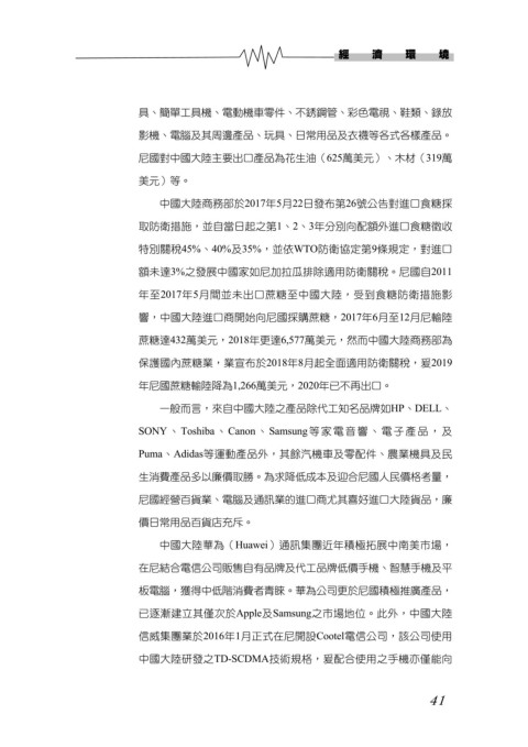 尼國對中國大陸主要出口產品為花生油(625萬美元)、木材(319萬
