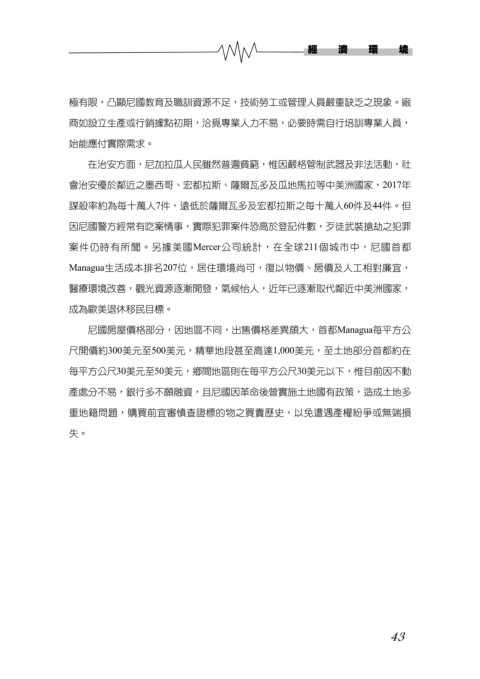 Managua生活成本排名207位,居住環境尚可,復以物價、房價及人工相對廉宜,