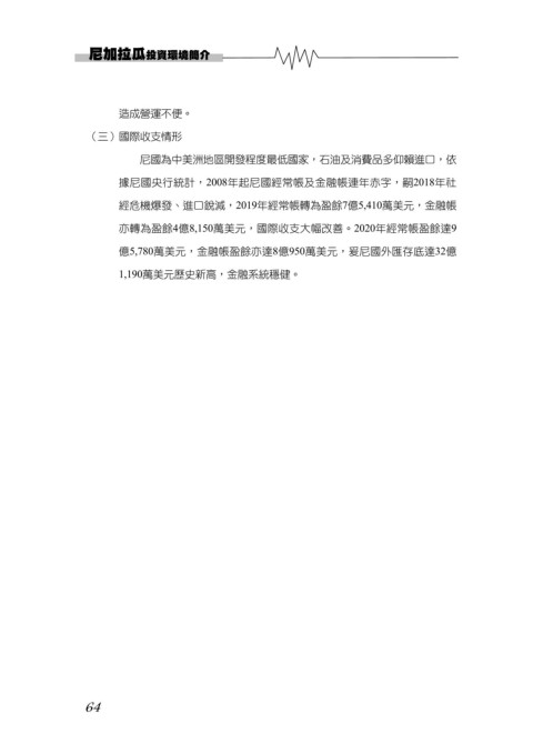 尼加拉瓜投資環境簡介 造成營運不便。 (三)國際收支情形 尼國為中美洲地區開發程度最低國家,石油及消費品多仰賴進口,依 據尼國央行統計,2008年起尼國經常帳及金融帳連年赤字,嗣2018年社 經危機爆發、進口銳減,2019年經常帳轉為盈餘7億5,410萬美元,金融帳 亦轉為盈餘4億8,150萬美元,國際收支大幅改善。2020年經常帳盈餘達9 億5,780萬美元,金融帳盈餘亦達8億950萬美元,爰尼國外匯存底達32億 1,190萬美元歷史新高,金融系統穩健。 64