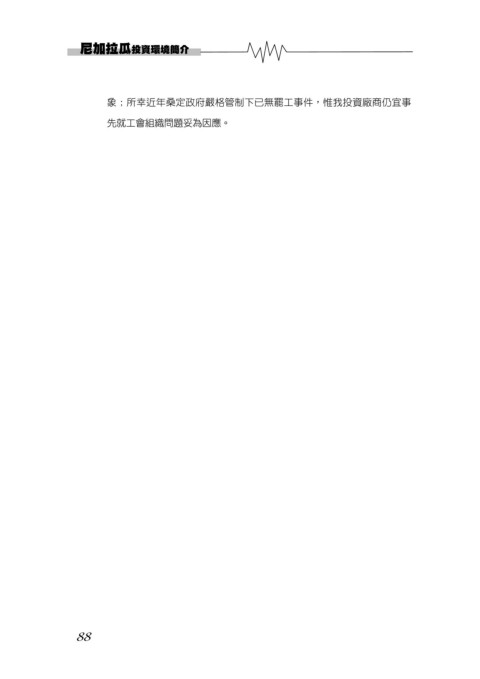 尼加拉瓜投資環境簡介 象;所幸近年桑定政府嚴格管制下已無罷工事件,惟我投資廠商仍宜事 先就工會組織問題妥為因應。 88