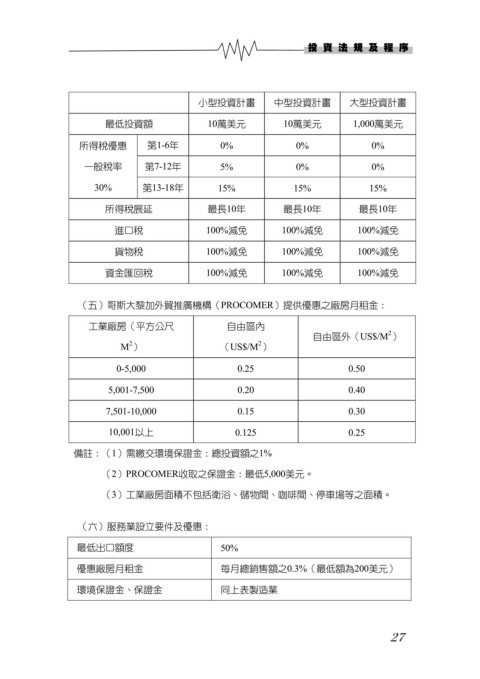 (五)哥斯大黎加外貿推廣機構(PROCOMER)提供優惠之廠房月租金: