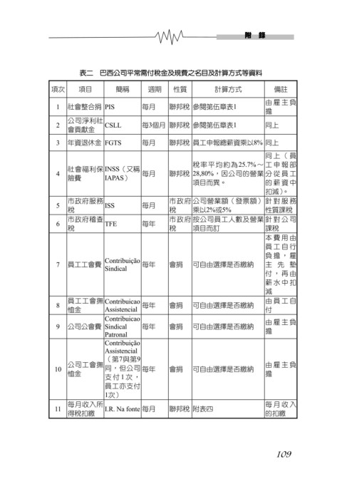 表二 巴西公司平常需付稅金及規費之名目及計算方式等資料