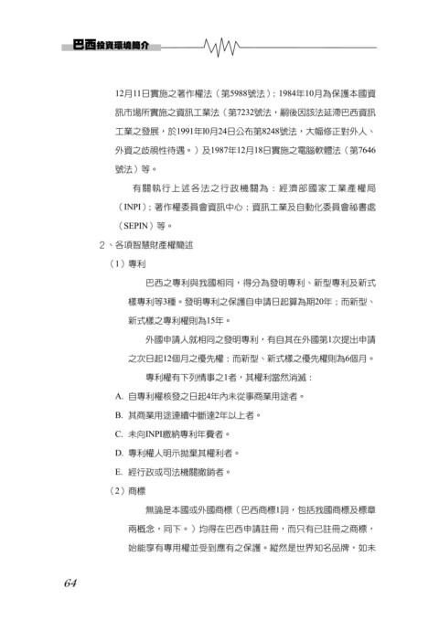 巴西之專利與我國相同,得分為發明專利、新型專利及新式