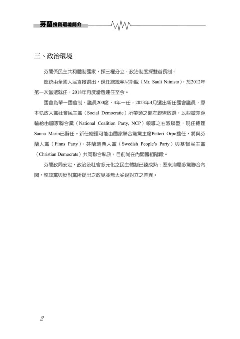 芬蘭政局安定,政治及社會多元化之民主體制已臻成熟;歷來均屬多黨聯合內