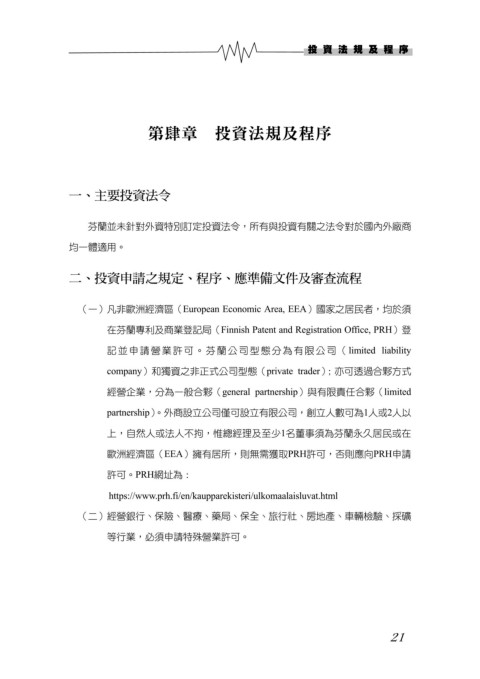 芬蘭並未針對外資特別訂定投資法令,所有與投資有關之法令對於國內外廠商
