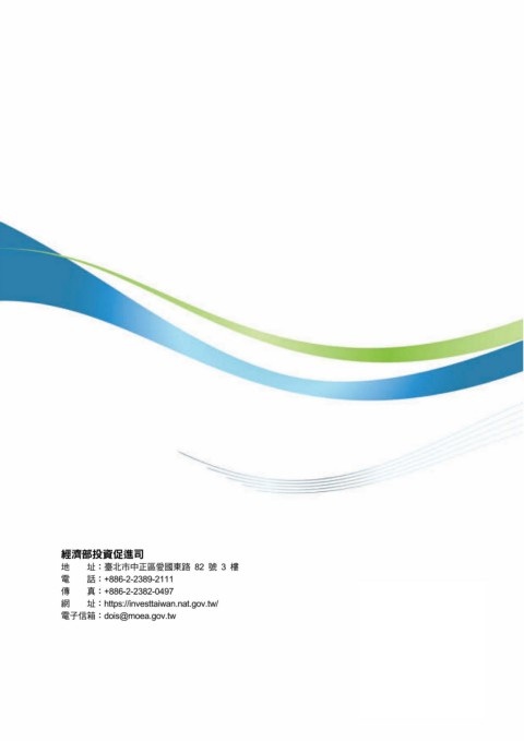 芬蘭投資環境簡介 經濟部投資促進司 地 址:臺北市中正區愛國東路 82 號 3 樓 電 話:+886-2-2389-2111 傳 真:+886-2-2382-0497 網 址:https://investtaiwan.nat.gov.tw/ 電子信箱:dois@moea.gov.tw 50