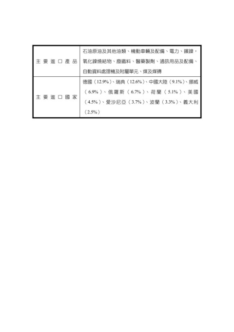 石油原油及其他油類、機動車輛及配備、電力、鑌鎳, 主要進口產品 氧化鎳燒結物、廢鐵料、醫藥製劑、通訊用品及配備、 自動資料處理機及附屬單元、煤及煤磚 德國(12.9%)、瑞典(12.6%)、中國大陸(9.1%)、挪威 ( 6.9% )、俄羅斯( 6.7% )、荷蘭( 5.1% )、美國 主要進口國家 (4.5%)、愛沙尼亞(3.7%)、波蘭(3.3%)、義大利 (2.5%)