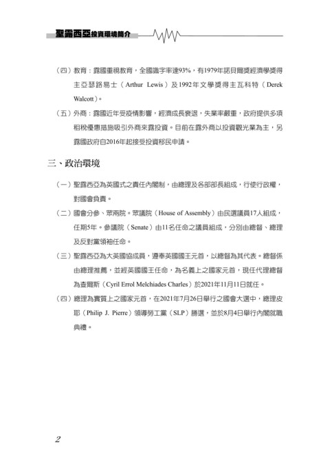 (三)聖露西亞為大英國協成員,遵奉英國國王元首,以總督為其代表。總督係