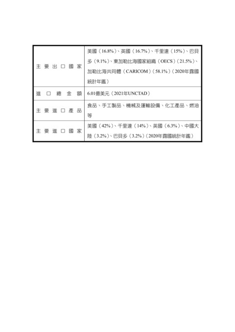 美國(16.8%)、英國(16.7%)、千里達(15%)、巴貝 多(9.1%)、東加勒比海國家組織(OECS)(21.5%)、 主要出口國家 加勒比海共同體(CARICOM)(58.1%)(2020年露國 統計年鑑) 進 口 總 金 額 6.01億美元(2021年UNCTAD) 食品、手工製品、機械及運輸設備、化工產品、燃油 主要進口產品 等 美國(42%)、千里達(14%)、英國(6.3%)、中國大 主要進口國家 陸(3.2%)、巴貝多(3.2%)(2020年露國統計年鑑)