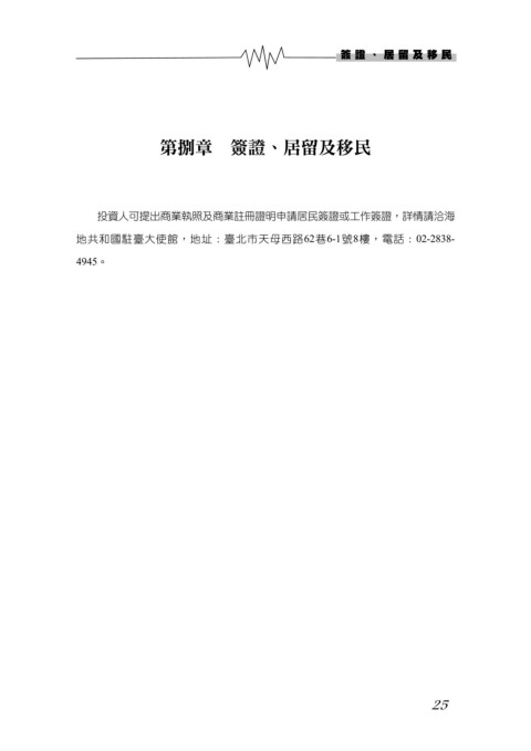 簽證、居留及移民 第捌章 簽證、居留及移民 投資人可提出商業執照及商業註冊證明申請居民簽證或工作簽證,詳情請洽海 地共和國駐臺大使館,地址:臺北市天母西路62巷6-1號8樓,電話:02-2838- 4945。 25