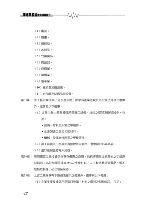 第33條: 手工藝企業從事上述生產活動,除享有產業法規及本投資法提供之優惠